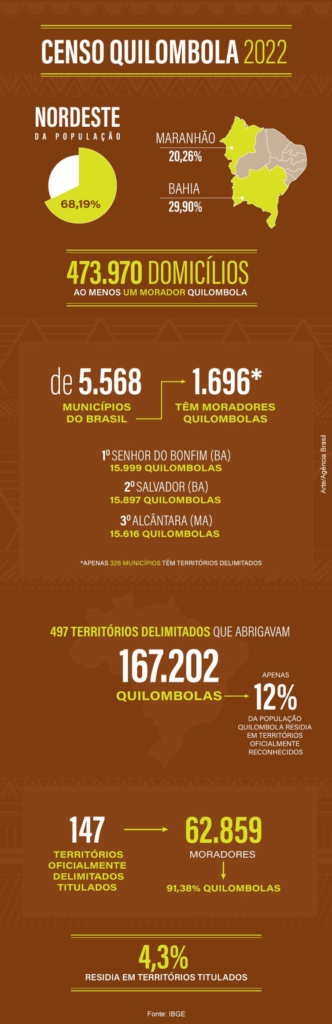 No universo das pessoas quilombolas residentes no país, as pessoas localizadas nos 494 territórios quilombolas oficialmente delimitados representam 12,59% dessa população (167.202 pessoas), de modo que 1.160.600 (87,41%) pessoas quilombolas encontram-se fora de áreas formalmente delimitadas e reconhecidas.
