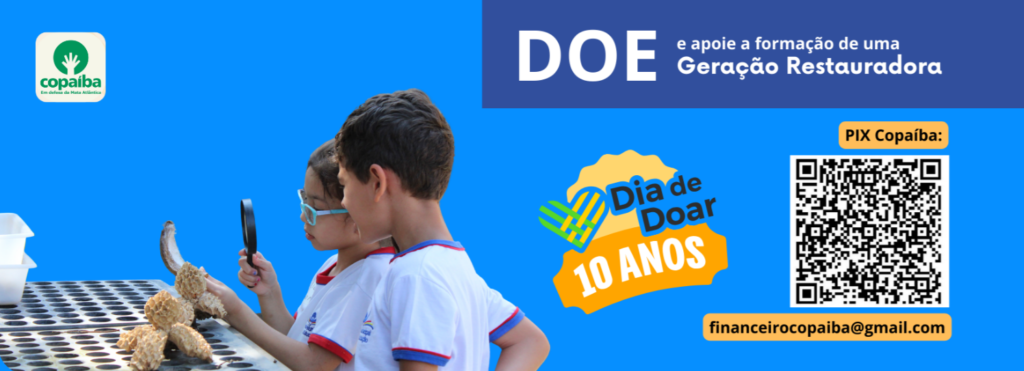 Desde 2013, o Brasil celebra o Dia de Doar e a 10ª edição vai acontecer em 28 de novembro. A data tem o objetivo de incentivar o país a ser mais generoso e solidário, e neste ano, a Associação Ambientalista Copaíba irá participar com a campanha voltada para a Educação Ambiental, onde prevê arrecadar recursos para mobilizar mais alunos e alunas a participarem das Vivências na Natureza. A campanha da Educação Ambiental oferece duas opções de participação: ao doar R$25 para a instituição é possível receber um exemplar do livro lançado recentemente: Viva a Mata Atlântica!, ou através de doações espontâneas para o Projeto Geração Restauração.