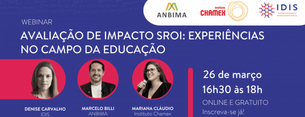 Reconhecido por sua ampla experiência no campo, o IDIS – Instituto para o Desenvolvimento do Investimento Social promove no dia 26 de março, às 16h30, o Webinar Avaliação de Impacto SROI: Experiências no Campo da Educação para debater e aprofundar o assunto.