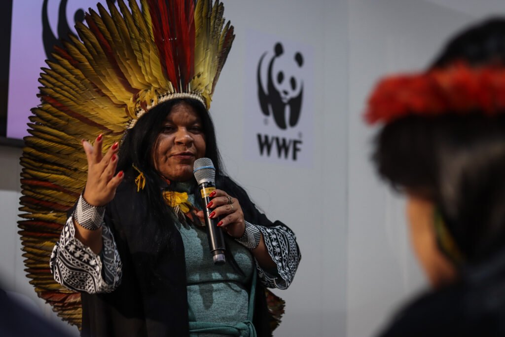 “Nas COPs, ou você participa como ONG, governo, ou empresa. Nós, indígenas, não estamos em nenhuma dessas categorias. Queremos ter essa diferenciação no nosso crachá, para mostrar essa participação indigena de forma diferenciada, como merecemos ser reconhecidos nesse espaço de debates”, explicou Sônia.