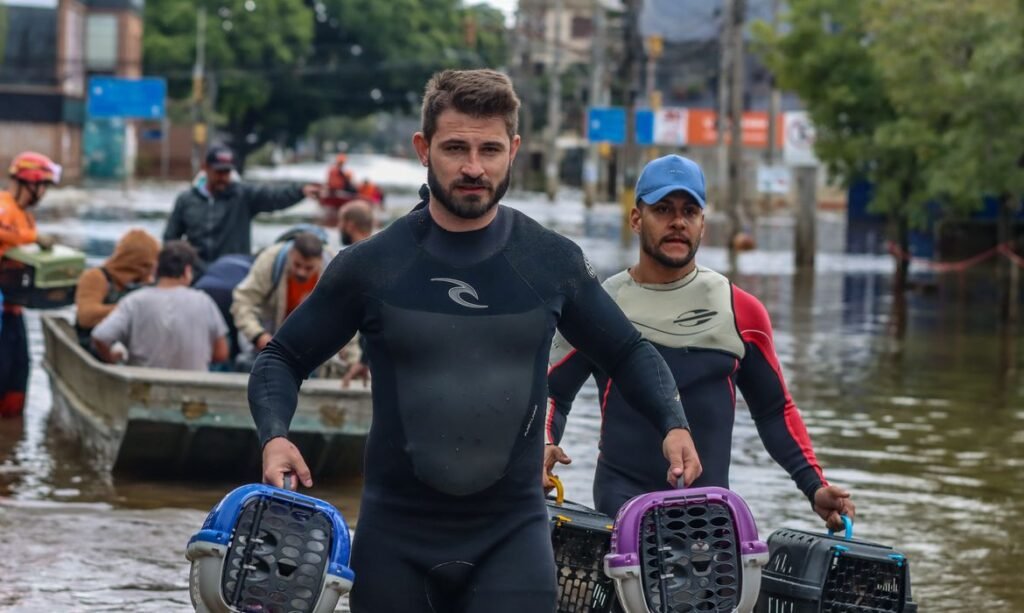 “Só hoje [sábado, 18], ainda retiramos 37 pessoas [da inundação]”, afirma Edmilson Brizola, um dos voluntários. Morador da região, ele ajudou a coordenar a logística das embarcações que navegam ruas adentro. Ele calcula que, apenas nesse ponto, mais de 5 mil pessoas foram resgatadas, além de outros 2 mil animais, entre gatos, cachorros, galinhas, cavalos, aves e até porcos.